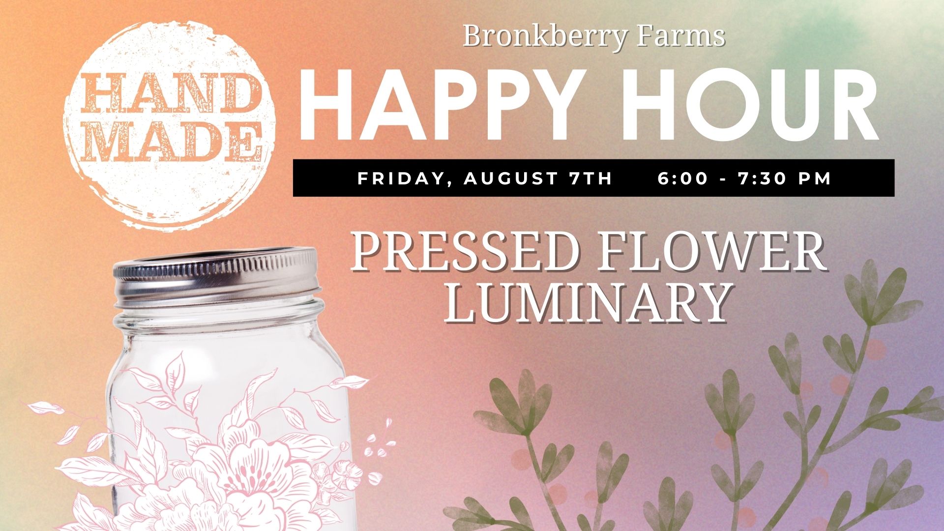 Bronkberry Farms & Greenhouse, 18061 Bronk Rd, Plainfield, IL 60586, USAPressed Flower Luminary Workshop A glowing BYOB craft night at Handmade Happy Hour โจ๐ธ Create something soft, glowing, and completely one of a kind at our Pressed Flower Luminary Workshop, ...