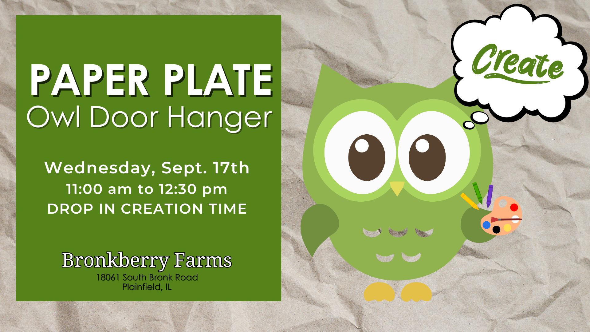 Bronkberry Farms & Greenhouse, 18061 Bronk Rd, Plainfield, IL 60586, USA🦉 Kids' Craft Class: Paper Plate Owl Door Hanger Come and make a paper plate owl hanger to decorate your door for the fall! You will be painting the plate, ...